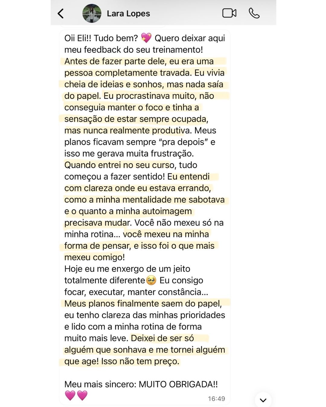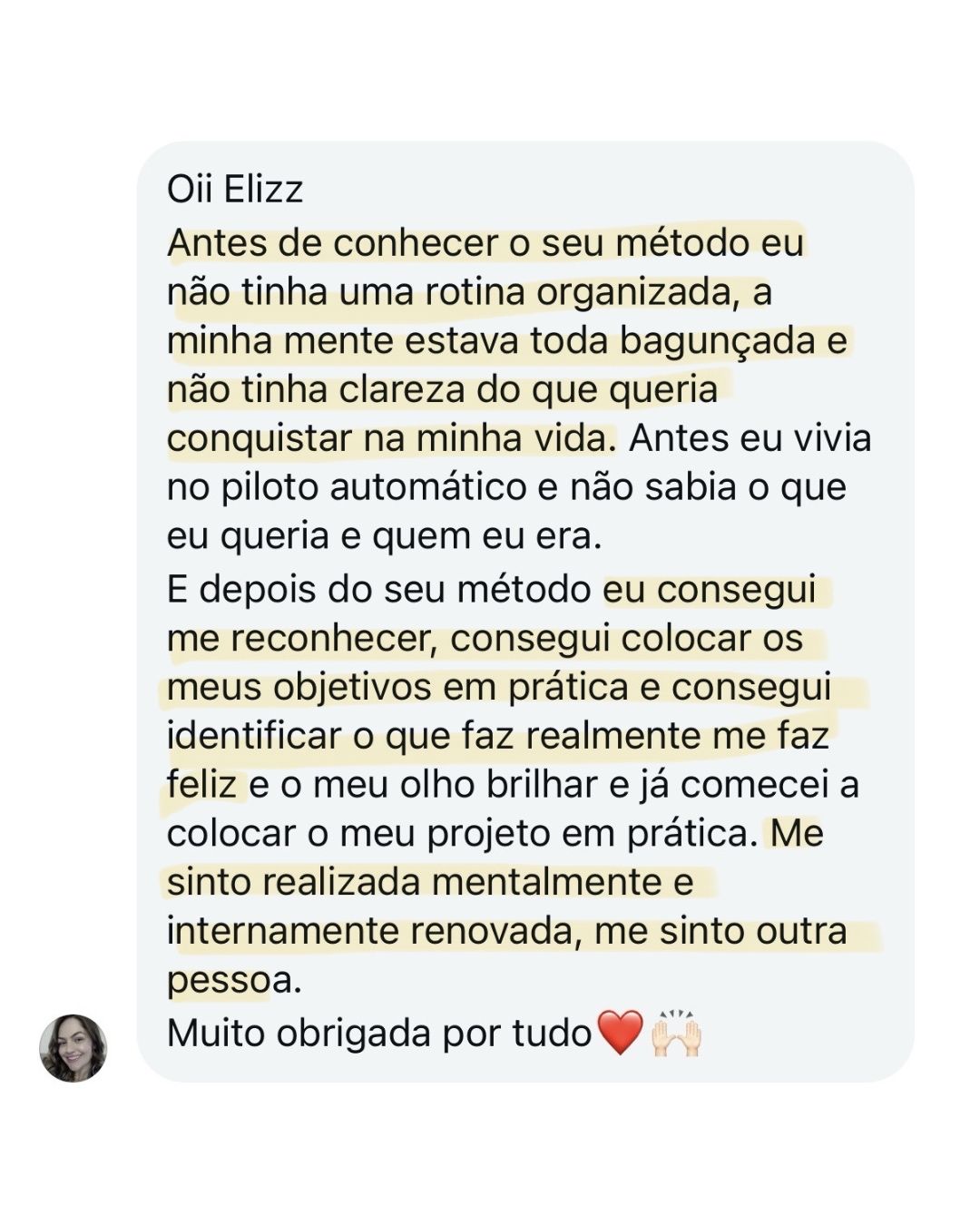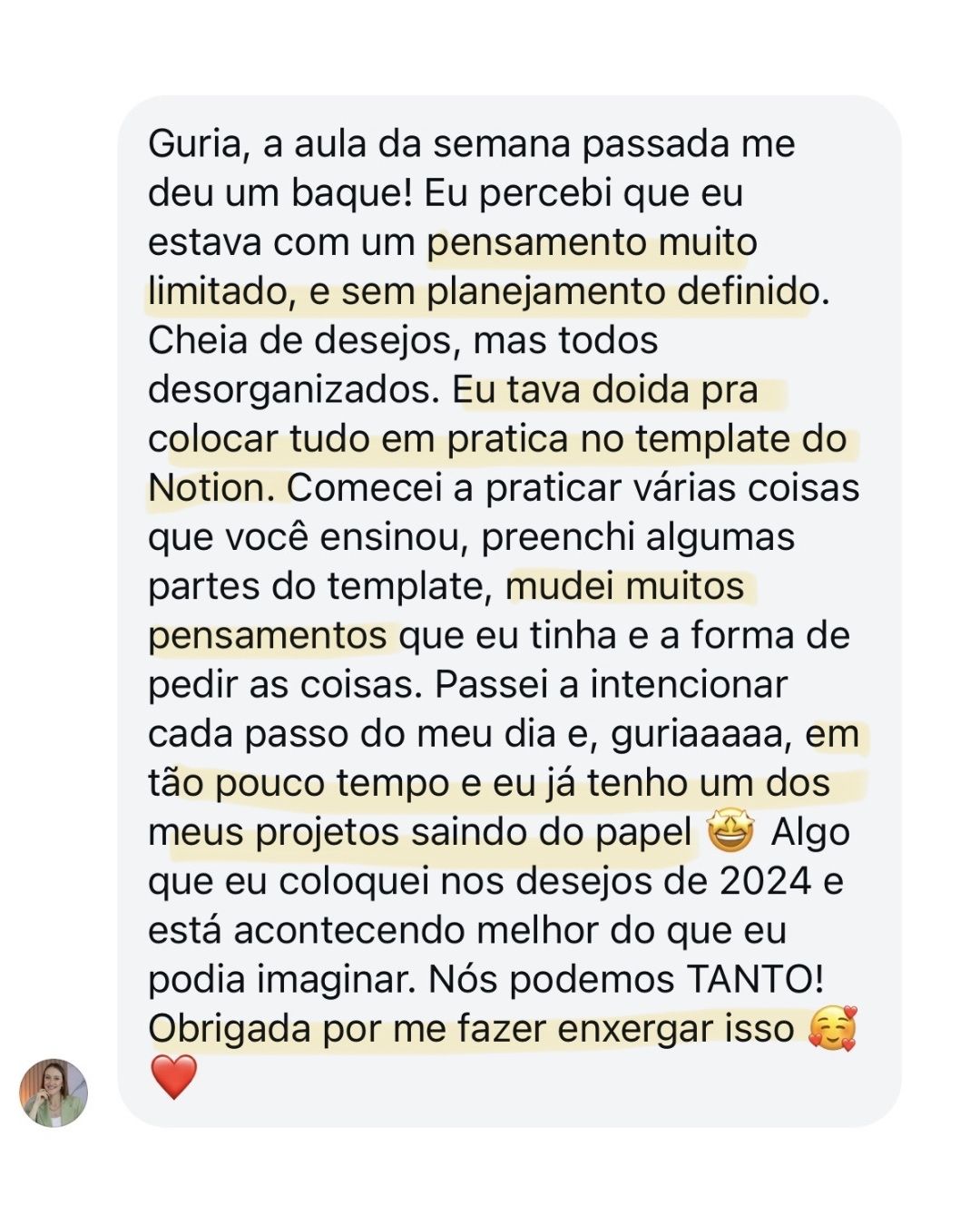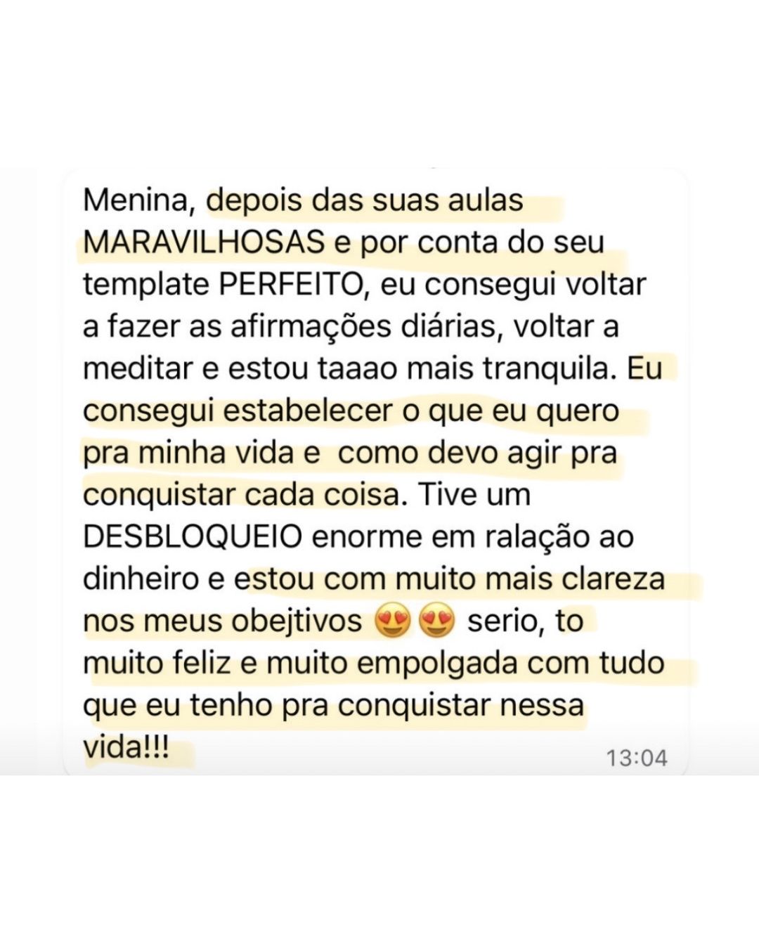 Muitas alunas relatam mudanças de perspectiva já nas primeiras aulas. Resultados concretos na vida, nos negócios e nas finanças aparecem gradualmente à medida que você aplica os protocolos. Por isso, o acesso é de 1 ano — para que você aplique, ajuste e sustente.